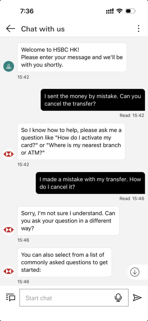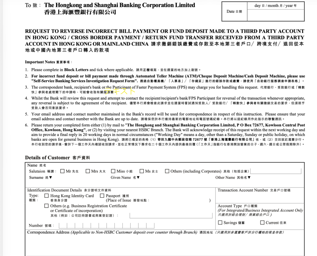 HSBC HKのモバイルアプリから自分のアカウント内でのTransfer(USD→HKD)をするはずが、間違えて他の振込先へTransfer(振込)してしまった場合どうなるのか?