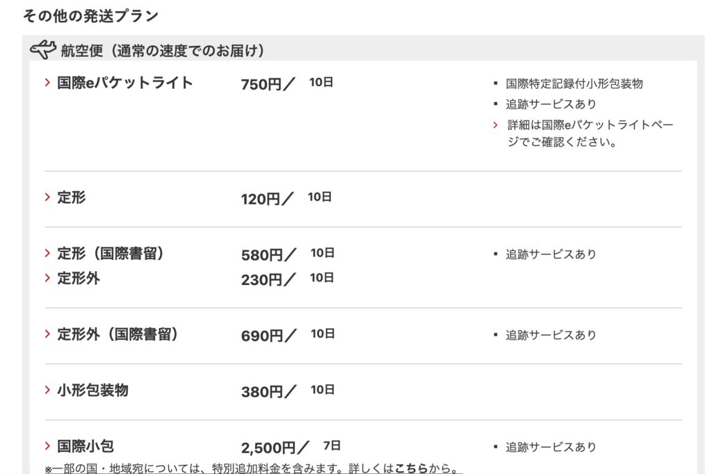 定型サイズの航空便(エアメール)であれば最安120円(10日前後の日数が必要)〜となります。